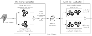 Video Thumbnail Selector: Combining Adversarial and Reinforcement Learning. This software can be used for training a deep learning architecture for video thumbnail selection, taking under consideration the representativeness and the aesthetic quality of the video frames. Training is fully-unsupervised, based on a combination of adversarial and reinforcement learning. After being trained on a collection of videos, the Video Thumbnail Selector is capable of selecting a set of representative video thumbnails for unseen videos.