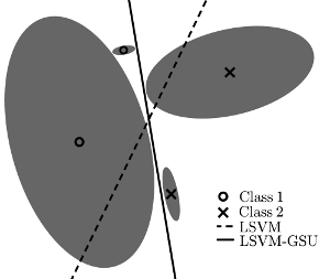 Support Vector Machine with Gaussian Sample Uncertainty (SVM-GSU). This is a novel maximum margin classifier that deals with uncertainty in data input; i.e., it allows each training example to be modeled as a multi-dimensional Gaussian distribution described by its mean vector and covariance matrix (the latter modeling the uncertainty), and defines a cost function that exploits the covariance information. Experimental results verify the effectiveness of this approach in various learning problems.