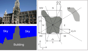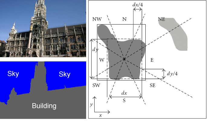 Spatial image segmentation. We developed a fully automated method for the fast segmentation of images to spatial regions, for use in object-based multimedia applications such as ontology-based indexing and retrieval. The algorithm operates in the combined intensity–texture–position feature space, in order to produce connected regions that correspond to the depicted real-life objects. A fast multi-layer processing scheme restricts the iterative part of the segmentation procedure to a low-resolution version of the image, and then derives full-resolution segmentation masks by partial pixel re-classification (watch animation for images zebra, castle). [ijprai04] [jasp04]