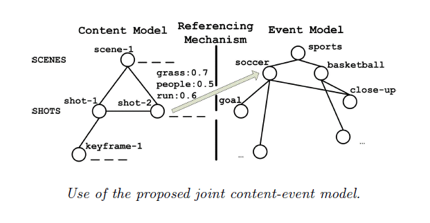 Event-based indexing of multimedia. We develop a joint content-event model for the automatic indexing of multimedia content with events. This model treats events as first class entities and provides a referencing mechanism for automatically linking event elements, represented using the event part of the model, with content segments, described using the content part of the model. The referencing mechanism uses a large number of trained visual concept detectors to describe content segments with model vectors, and the subclass discriminant analysis algorithm to derive a discriminant subspace of this concept space, facilitating the indexing of content segments with event elements. [eimm10] [cbmi11]